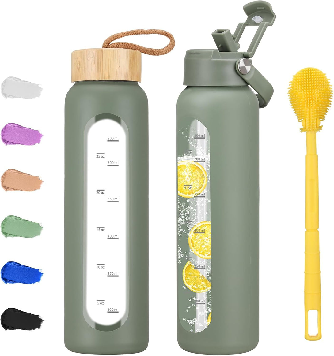 - GLASS WATER BOTTLE WITH SILICONE SLEEVE:Water bottle made of premuim borosilicate glass which is is free from BPA, BPS, PVC, and lead. The stylish silicone sleeve adds extra protection against slips and falls.It can withstand high and low temperatures without shattering or cracking, you can enjoy the happy hour of drinking hot and cold water.