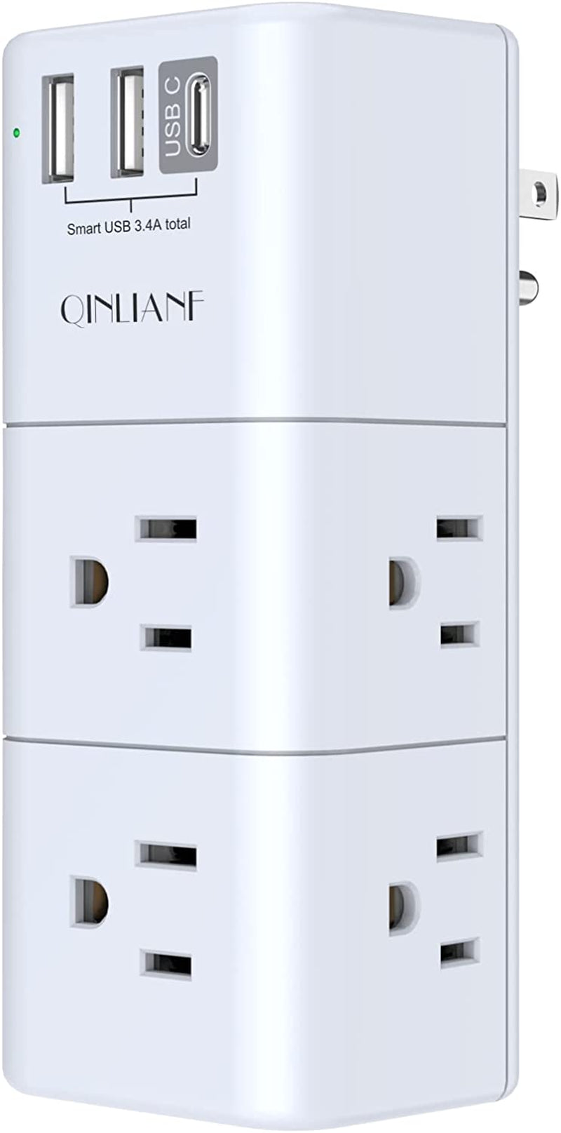 USB Outlet Extender Surge Protector - QINLIANF Rotating Plug, 3-Sided Swivel Power Strip, 6 AC Spaced Outlet Splitter and 3 USB Ports (1 USB C) for Travel, Home, Office, ETL